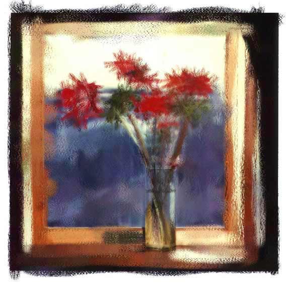 Tom's greenhouse window/ red on blue